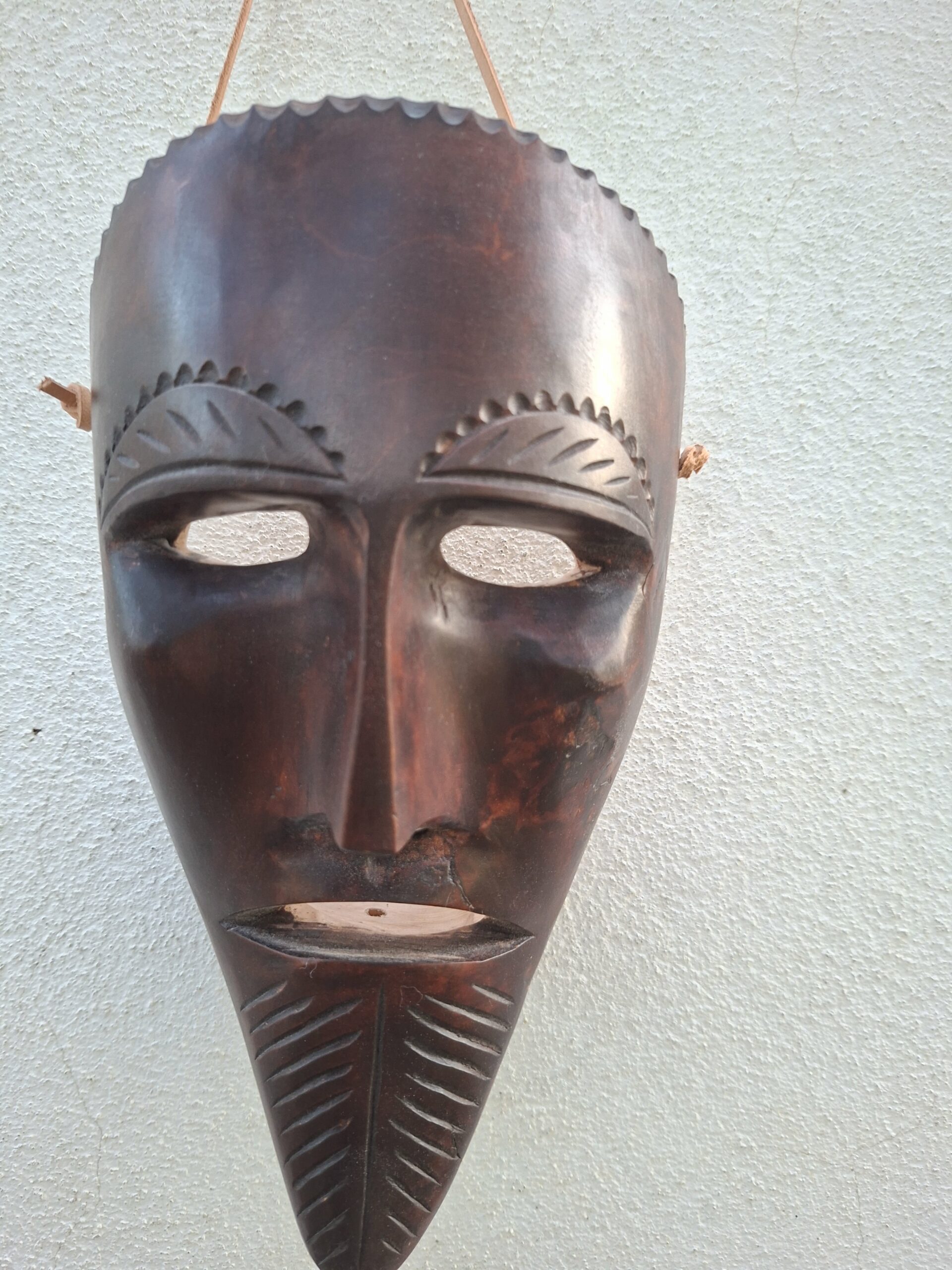 Maschera "de Merdule" realizzata in legno di pero lungamente stagionato. Intagliata con scalpello e coltello e rifinita con cere pregiate. La maschera ha un'espressione seria, con la barba intagliata a coltello e riproduce un modello tradizionale del Merdule. Indossabile, misura circa 25 cm